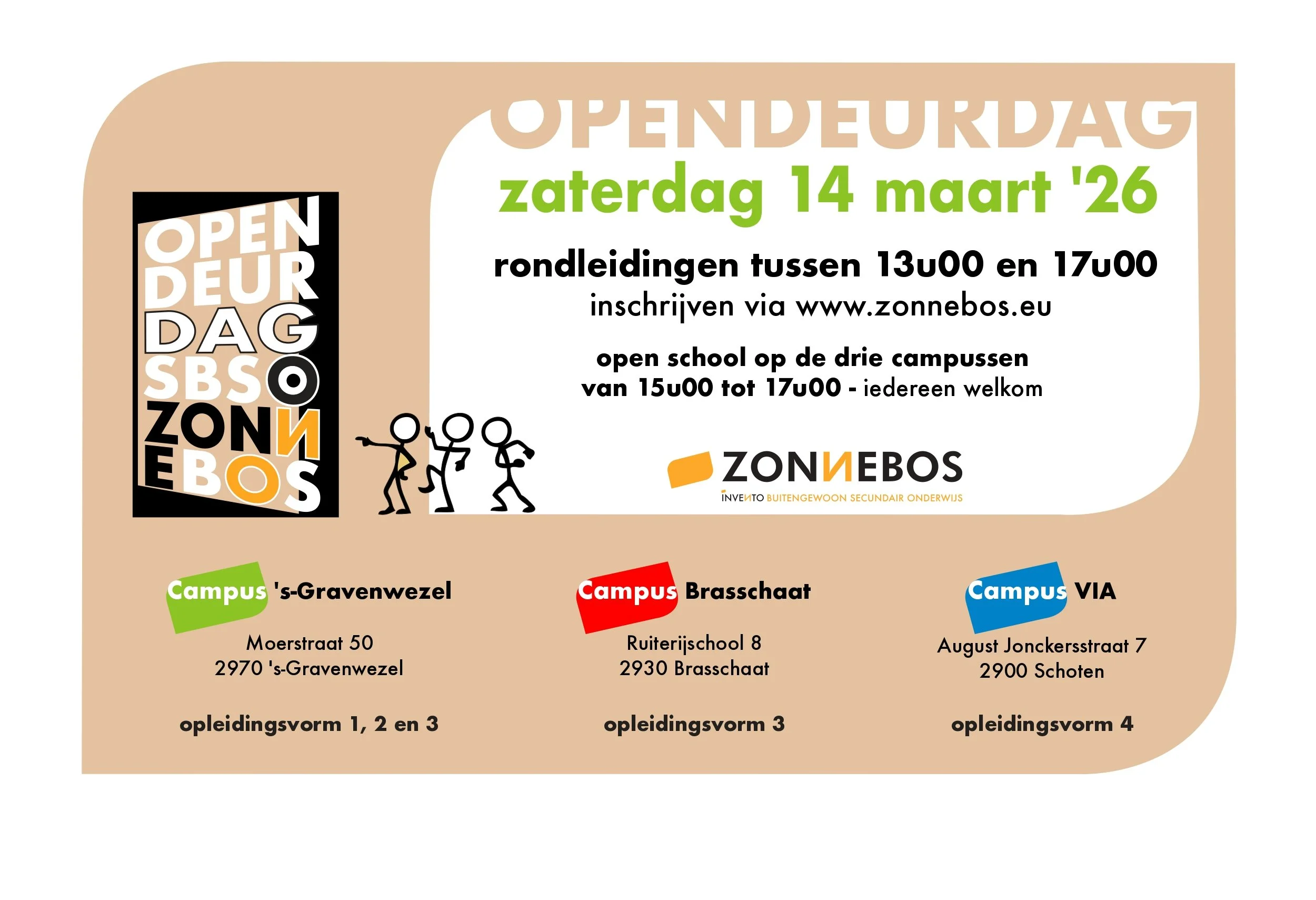 Tijdens deze dag kan je onze school en klaslokalen bezoeken, kennismaken met de leerkrachten en directie en meer informatie krijgen over onze werking en studierichtingen. Er zijn rondleidingen voorzien en je kan al je vragen stellen, hiervoor kan je via deze LINK inschrijven.